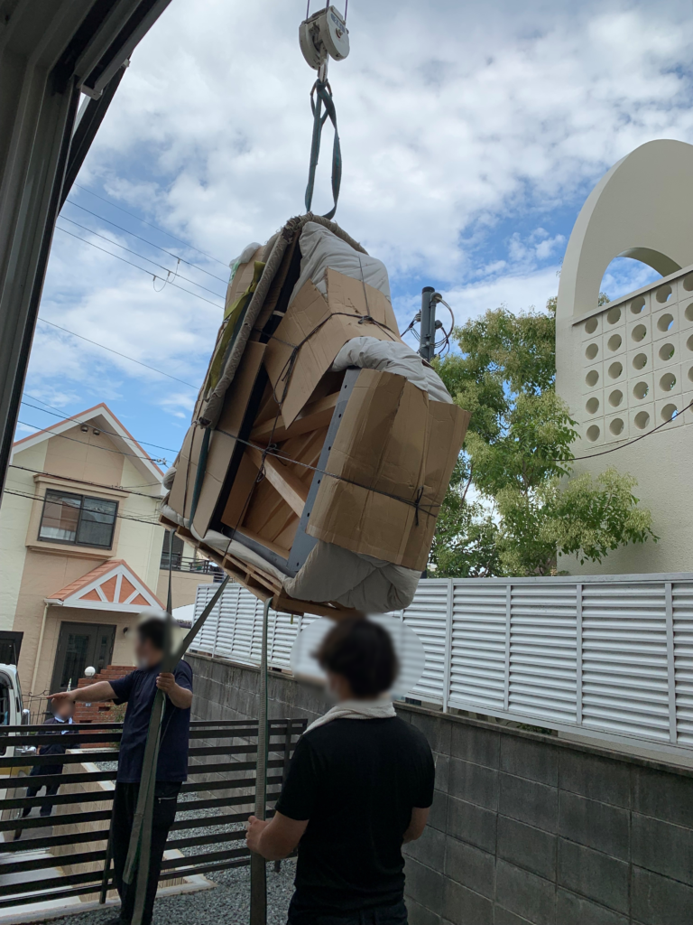 半年以上待ってやっと来ました。 SK2です。 クレーンで吊り下げて納入です。 さすが慣れていますね。 1週間前に搬入経路確認に来てもらいました。 4人がかりで設置です。 脚やペダルが付いて325kgくらいだったので、無い場合でも布や下の木製パレットが付いているので315kgくらいあるんじゃないかな。